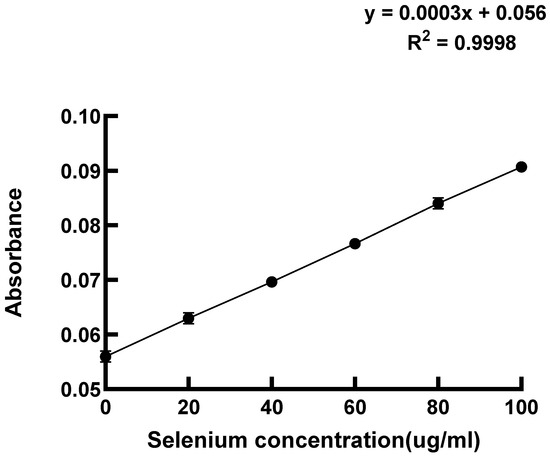Based on the optimal selenium enrichment concentrations identified for various strains in Table 1, the selenium enrichment rates were assessed post-cultivation, as depicted by the standard curve in Figure 2. The selenium standard curve shown in Figure 2 was fitted linearly (regression equation: y = 0.0003x + 0.056, R2 = 0.9998). The high R2 value (>0.995) of this linear model ensures the reliability of the quantitative results.