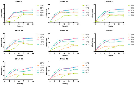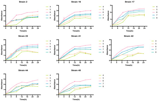 From the growth status under different temperatures, it was found that, when the temperature reached 37 °C, the absorbance of the eight strains reached the highest during the stationary growth phase. Moreover, excessively low or high temperatures would inhibit the growth of LAB, as shown in Figure 4.