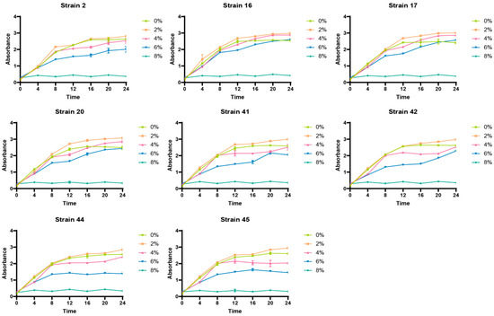 The analysis of different salt concentrations showed that, when the salt concentration reached 2%, the absorbance of the eight strains peaked during the stationary growth phase, and excessively high salt concentrations would inhibit the growth of LAB, as shown in Figure 5.