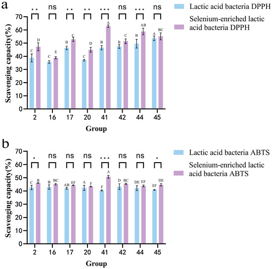(a) DPPH and ABTS free radical scavenging capacity of LAB before and after selenium enrichment. (b) ABTS free radical scavenging capacity of LAB before and after selenium enrichment. Figure legend: Different uppercase letters indicate significant differences between different strains (p < 0.05); * indicates significant differences between the same strain before and after selenium enrichment (p < 0.05), ** (p < 0.01) and *** (p < 0.001) indicate greater significant differences; ns indicates no significance.
