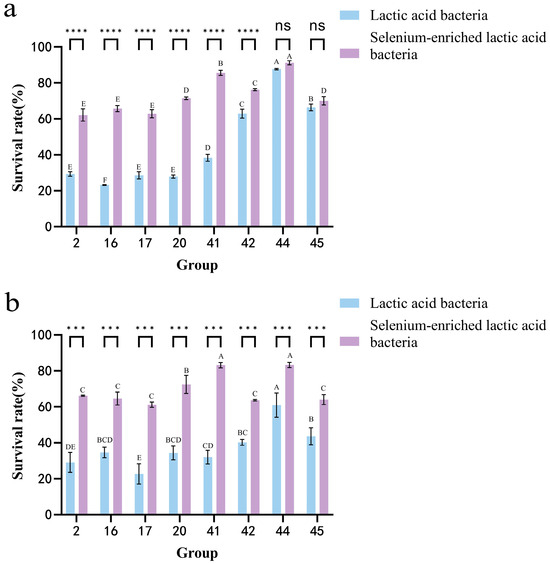 (a) Intestinal juice tolerance of LAB before and after selenium enrichment. (b) Gastric juice tolerance of LAB before and after selenium enrichment. Different uppercase letters indicate significant differences between different strains (p < 0.05); *** (p < 0.001) indicates significant differences between the same strain before and after selenium enrichment, **** (p < 0.0001) indicates greater significant differences; ns indicates no significance.