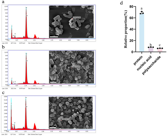 SEM-EDX analysis confirmed the presence of nano-scale selenium on the cell surface. Quantitative analysis showed that selenium was mainly distributed in selenoproteins (68.94%), followed by nucleic acids and polysaccharides, indicating that selenoproteins are the main storage form of organic selenium in these strains.