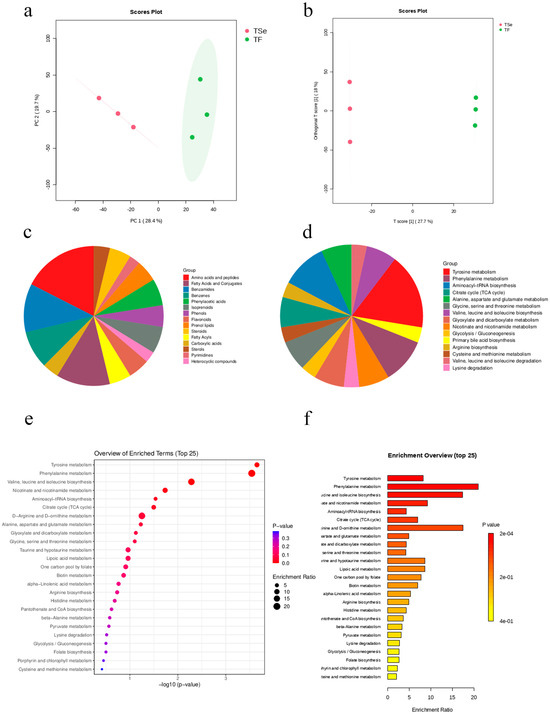 To investigate metabolite changes in LAB before and after selenium enrichment, untargeted metabolomics analysis using LC-MS/MS was conducted. This analysis identified 3211 compounds in positive mode, with organic heterocyclic compounds being the most abundant (21.40%), followed by lipids (19.96%), benzene compounds (14.80%), and organic acids (14.54%). In negative mode, 1311 compounds were identified, with lipids (17.70%), organic acids (17.32%), benzene compounds (16.32%), and organic heterocyclic compounds (15.64%) being prominent. The PCA (Figure 10a) and OPLS-DA (Figure 10b) score plots showed an interpretability of 48.1% and 45.7%, respectively. The TF group (non-selenium-enriched LAB metabolites) and TSe group (selenium-enriched LAB metabolites) showed distinct differences. In metabolomics, identifying differential metabolites is crucial for understanding biological changes. Using the criteria of log2FC ≥ 1, p-value < 0.05, and VIP value ≥ 1, 491 differential metabolites were identified. The TSe group had 324 downregulated and 167 upregulated metabolites compared to the TF group. After matching with the HMDB database, 80 differential metabolites were found, with amino acids and peptides making up 18% and fatty acids and conjugates 13%. The addition of selenium mainly influences amino acid and fatty acid metabolism [33]. Metabolic pathway enrichment analysis, matched with the KEGG database, highlights the impacts on pathways such as tyrosine, phenylalanine, and aminoacyl-tRNA biosynthesis, among others [34]. This suggests that selenium affects amino acid and carbohydrate metabolism. Amino acids are known to benefit the immune and digestive systems [35]. They can support intestinal and overall body health, boost immune function, provide antioxidant benefits, speed up wound healing, and promote cardiovascular, liver, and blood sugar health [35,36]. Analysis showed significant metabolic pathway differences between the TF and TSe2 groups, including tyrosine and phenylalanine metabolism, valine, leucine, and isoleucine biosynthesis, nicotinate and nicotinamide metabolism, aminoacyl-tRNA biosynthesis, the TCA cycle, and arginine metabolism.