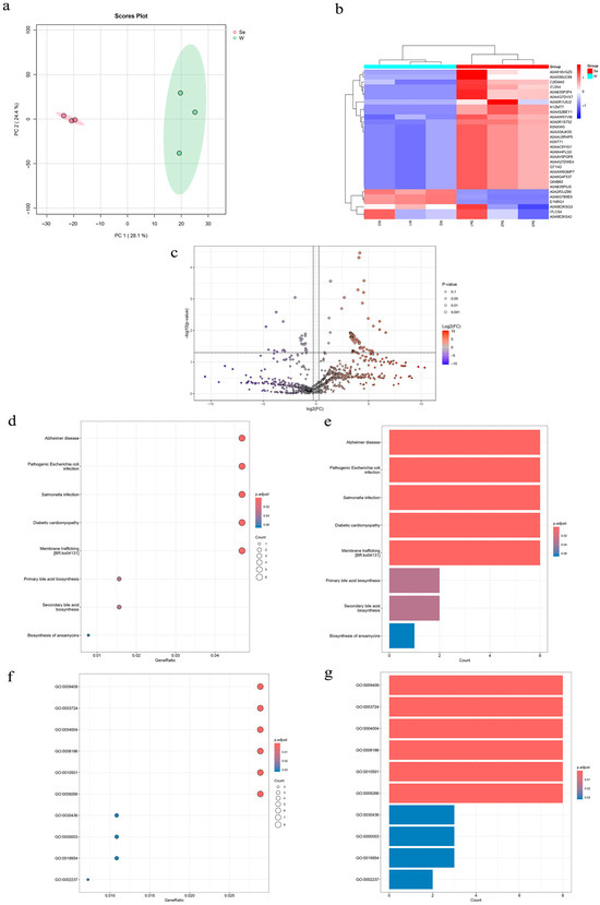 (a) PCA score plot. (b) Clustering heatmap of differential proteins. (c) Protein volcano plot. (d) Bubble plot of differential protein KEGG enrichment. (e) Bar plot of differential protein KEGG enrichment. (f) Bubble plot of differential protein GO enrichment. (g) Bar plot of differential protein GO enrichment.