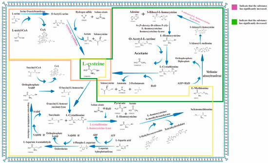 Metabolomic and proteomic studies revealed that, due to the chemical similarity between selenium and sulfur, selenium competitively binds to key enzymes such as cysteine-S-conjugate β-lyase, S-adenosyl-L-homocysteine hydrolase, and cysteine synthase to promote the conversion of serine and methionine to selenocysteine, and aspartate to selenomethionine, thereby regulating amino acid metabolic pathways. This explains the significant decrease in cysteine and the differences in protein expression.