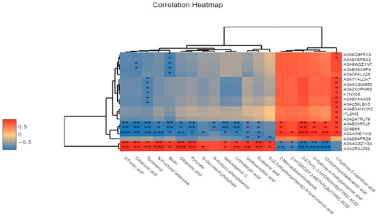 Correlation heatmap of differential metabolites and differential proteins. Figure legend: * indicates a significant correlation (p < 0.05); ** and *** indicate a stronger correlation.
