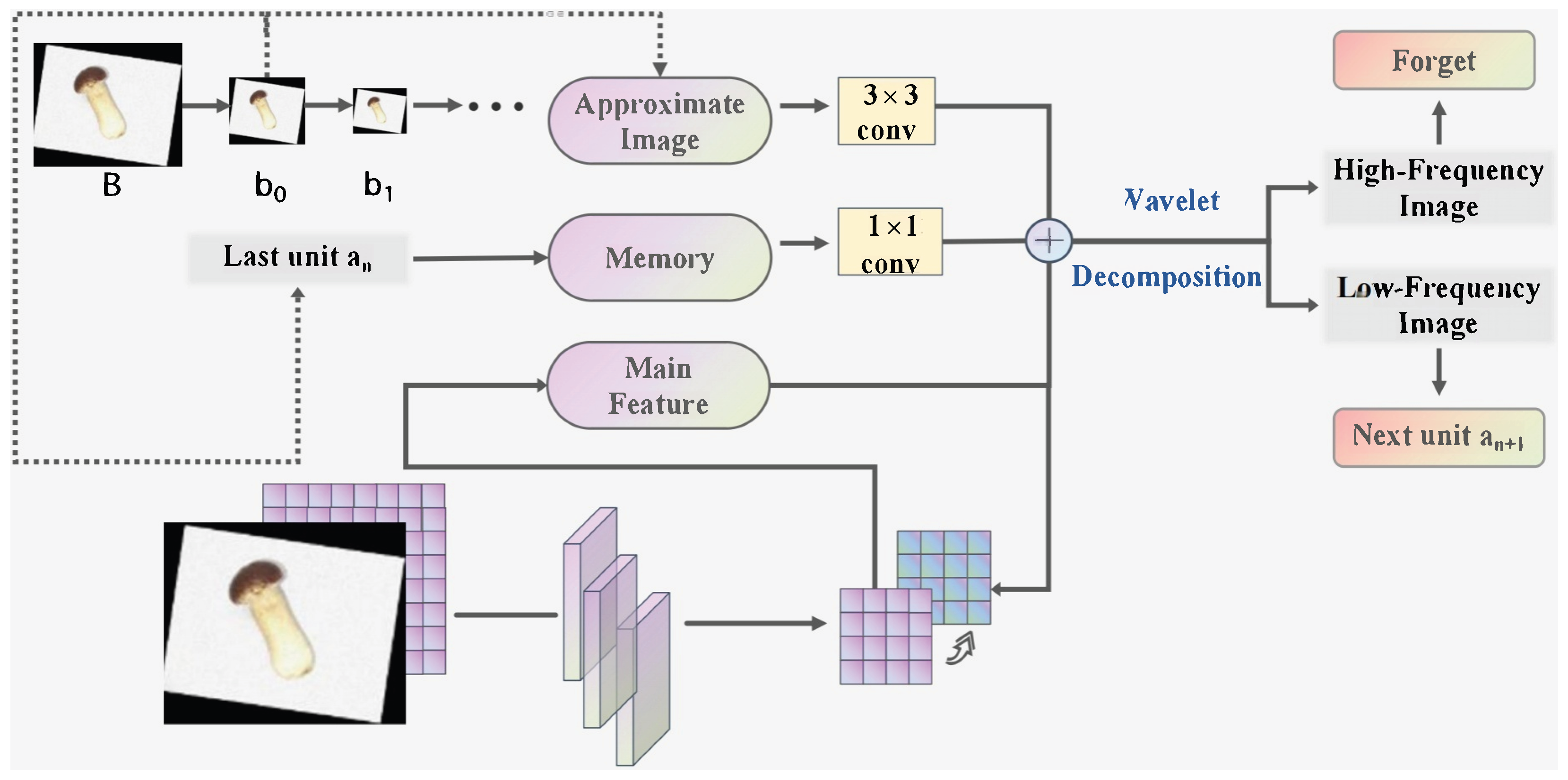 - Input ComponentsEach unit n receives three inputs:Memory feature : Output of the previous unit, representing accumulated low-frequency information from prior decompositions.Approximate image : Low-frequency (LL) sub-band from the n-th wavelet decomposition of the original image, containing global structural information at scale n. For the initial unit (), the memory feature is initialized as .Main feature map: Output of the n-th convolutional downsampling layer in the backbone, rich in high-frequency details but lacking low-frequency context.