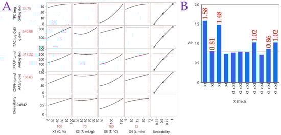 The effects of extraction parameters (X1–X4) were evaluated using a partial least squares (PLS) model, with the correlation loading plot presented in Figure 1A. This analysis highlighted the influence of each factor on OSW extracts. Solvent composition (X1) exerted the strongest effect, with 100% ethanol yielding the highest responses across assays. The liquid-to-solid ratio (X2) of 70 was identified as optimal for efficient extraction. Temperature (X3) also showed a positive contribution, with 160 °C being the most favorable condition. Finally, extraction time (X4) demonstrated a positive association with responses, indicating that longer durations (25 min) were generally more effective.