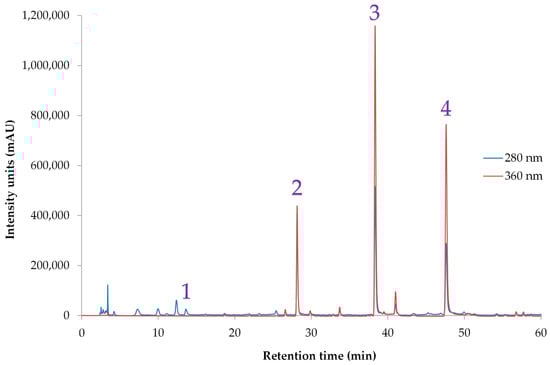 The analysis was conducted using a Shimadzu CBM-20A liquid chromatograph coupled with a Shimadzu SPD-M20A diode array detector (Shimadzu Europa GmbH, Duisburg, Germany), following the procedure described in a previous study [28]. Separation was performed on a Phenomenex Luna C18 (2) column (100 Å, 5 μm, 4.6 × 250 mm; Phenomenex Inc., Torrance, CA, USA) maintained at 40 °C. The mobile phase consisted of (A) 0.5% aqueous formic acid and (B) 0.5% formic acid in acetonitrile/water (6:4, v/v). The gradient elution was programmed as follows: 0% B at the start, increased to 40% B, then to 50% B within 10 min, further raised to 70% B over the next 10 min, and maintained at 70% B for 10 min. The mobile phase flow rate was 1 mL/min. Compounds were identified by comparing their retention times and UV–Vis spectra with those of authentic standards. Quantification was based on calibration curves prepared with concentrations ranging from 0 to 50 μg/mL.