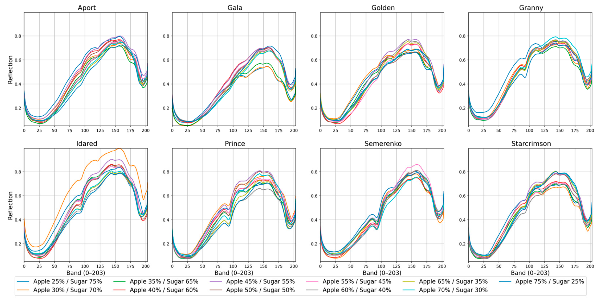 Figure 4. Reflectance spectra (unitless, after white/dark reference calibration) of jam samples prepared from eight apple cultivars (Aport, Gala, Golden, Granny Smith, Idared, Prince, Semirenko, and Starcrimson) across eleven sugar concentration levels (25–75%). Data were acquired using Specim IQ in the 400–1000 nm range with 204 bands.