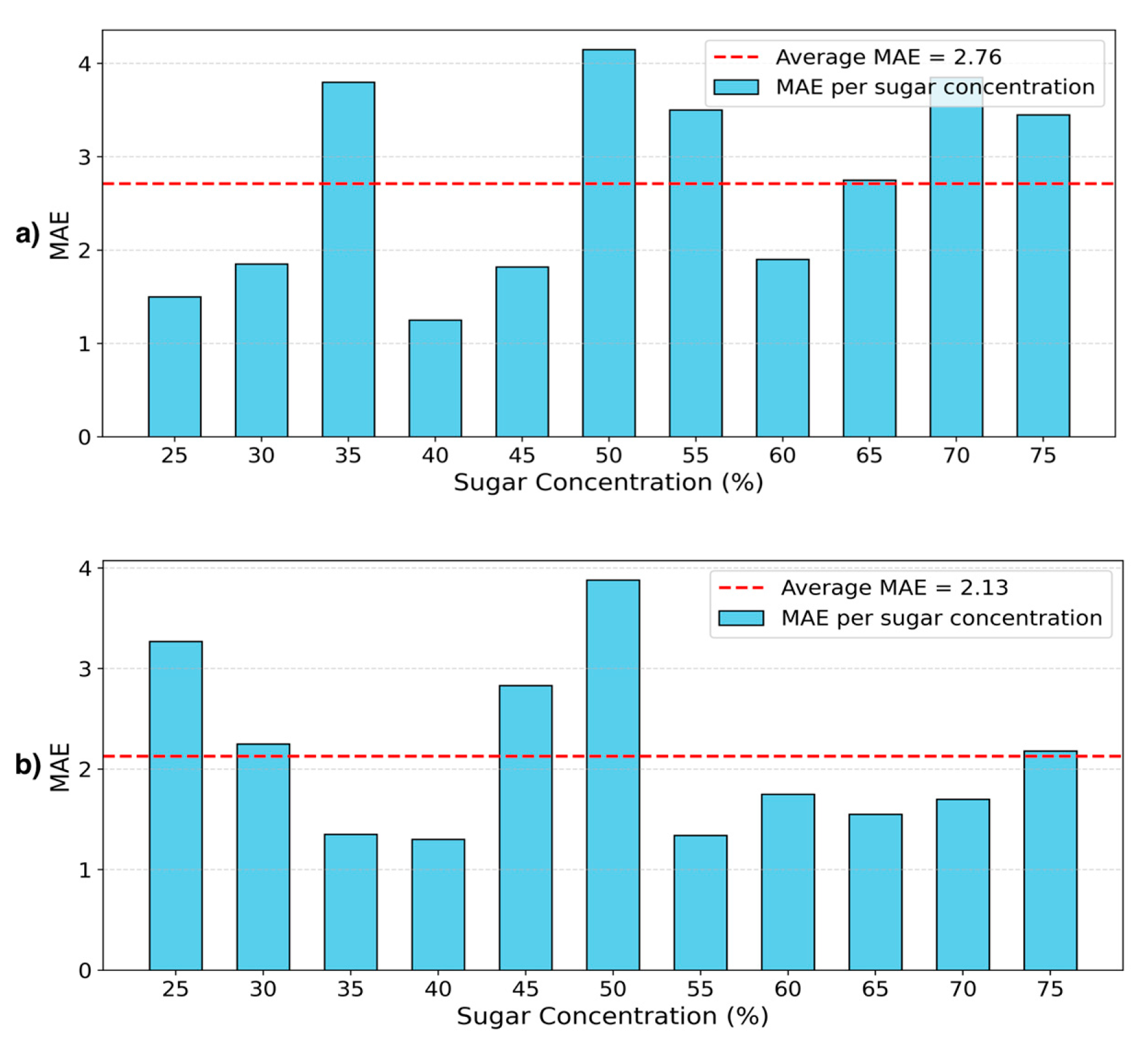 Figure 6. MAE per class for the best-performing ResNet model under two data-splitting strategies: (a) cultivar-based splitting and (b) sugar concentration-based splitting.