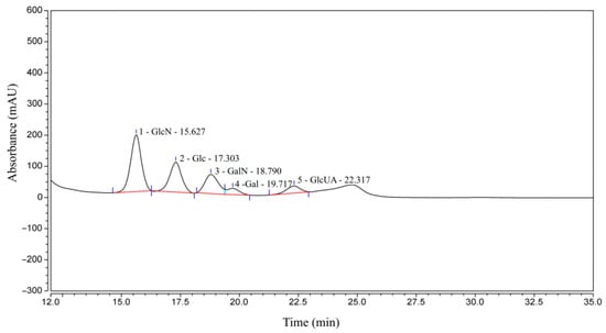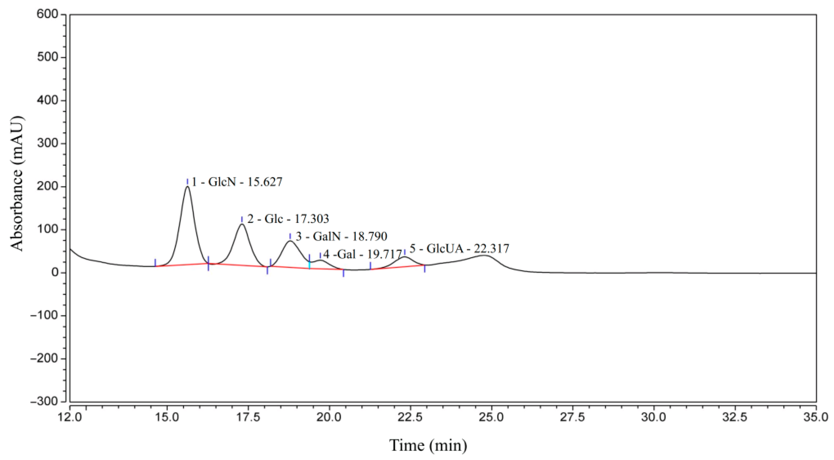 The sugar composition of CCS is shown in Figure 1 and Table 1. Specifically, GlcN is the most abundant component at 43.75%, followed by Glc at 25.51%, GalN at 18.41%, GlcUA at 6.86%, and Gal at 5.47%. The presence of monosaccharides, such as Glu and Gal, in the composition analysis can be primarily attributed to the following two factors. Firstly, the harsh acid hydrolysis conditions employed for monosaccharide determination readily cause the deacetylation and degradation of the core CS unit, Gal-NAc, generating Gal and GalN as major products, while GlcA can also be decarboxylated. Consequently, the substantial Gal detected is presumably derived primarily from the degradation of GalNAc, a well-documented complication in GAG analysis. Secondly, the potential presence of trace polysaccharide impurities is acknowledged, wherein minor GlcN might suggest the presence of trace hyaluronic acid or heparan sulfate, and trace glucose could stem from co-extracted glycogen. However, the overwhelming dominance of Gal (primarily derived from GalNAc) in the relative monosaccharide abundance strongly supports CS as the principal polysaccharide. Therefore, based on the comparison with the CS standard as well as its sugar composition, CCS used in this study contains CS, as well as small amounts of other GAGs, such as hyaluronic acid and heparan sulfate/heparin.