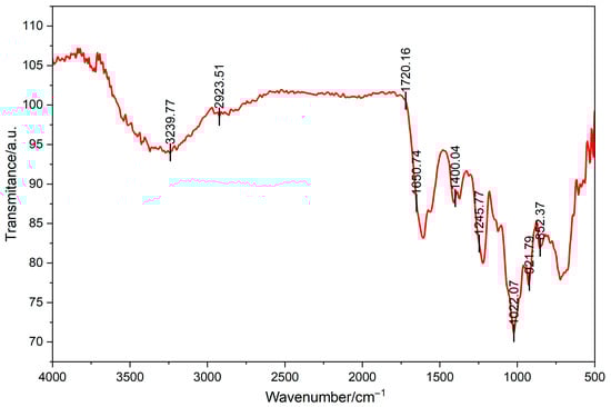 Twenty micrograms of the dried sample and 180 mg of dried KBr were ground uniformly in an agate mortar. The mixture was loaded into a pellet die and manually pressed. The resulting pellet was then transferred carefully into the sample chamber. Fourier transform infrared spectroscopy was performed, and scanning was carried out within the wavenumber range of 4000–400 cm−1.