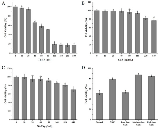 The effect of different treatments on the viability of ARPE-19 cells. (A) TBHP; (B) CCS; (C) NAC; (D) different doses of CCS. Low dose: 40 μg/mL; medium dose: 80 μg/mL; and high dose: 160 CCS. Different letters indicate significant differences (p < 0.05).