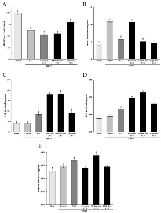 Based on a comprehensive analysis of antioxidant activity, CCS demonstrates significant dose-dependent antioxidant effects against TBHP-induced cellular damage. At 80 μg/mL, CCS optimally preserves cell viability (>90%) and exhibits potent ROS-scavenging activity, reducing ROS levels comparably to the positive control NAC. This dose also maximally activates antioxidant enzymes (CAT, SOD, GSH-Px) and suppresses lipid peroxidation (MDA), confirming enhanced cellular defense mechanisms. However, high-dose CCS (>320 μg/mL) induces cytotoxicity, diminishing cell survival and partially attenuating antioxidant enzyme activation despite further lowering ROS and MDA. NAC similarly reduces oxidative markers but exerts stronger negative effects on cell viability at higher concentrations. Fluorescence microscopy visually corroborates ROS suppression, with high-dose CCS showing the strongest inhibition. Thus, CCS exhibits strong antioxidant activity. Its antioxidant efficacy peaks at medium doses, balancing ROS clearance, enzyme induction, and cytoprotection without toxicity.