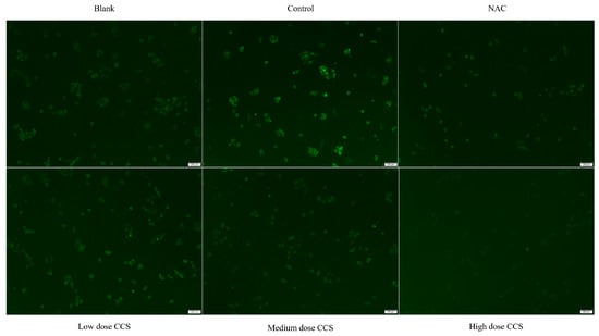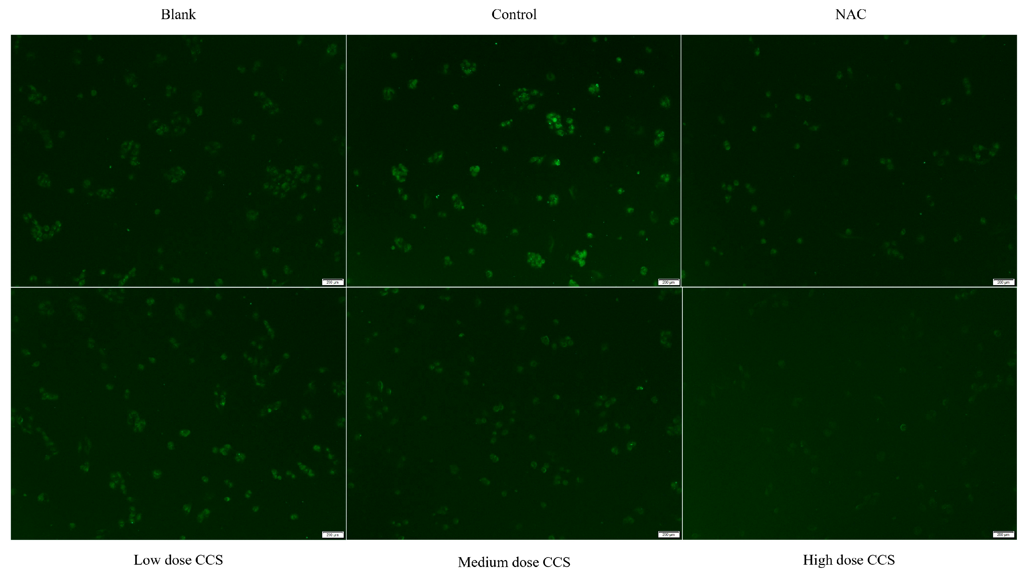 The fluorescence microscope photos provide a more intuitive representation of our experimental results (Figure 6). The blank group showed almost no fluorescence and low ROS levels, while the control group had high fluorescence intensity, indicating high ROS levels. The fluorescence intensity of both NAC and CCS groups significantly decreased, indicating a decrease in ROS levels. In the NAC group, the fluorescence intensity of low- and medium-dose CCS was similar to that of the blank group, with lower ROS levels. The fluorescence intensity of the high-dose CCS group was the lowest, lower than that of the blank group, indicating that high-dose CCS has an inhibitory effect on reactive oxygen species. Overall, high-dose CCS showed the best effect in reducing intracellular ROS levels, demonstrating strong antioxidant activity.