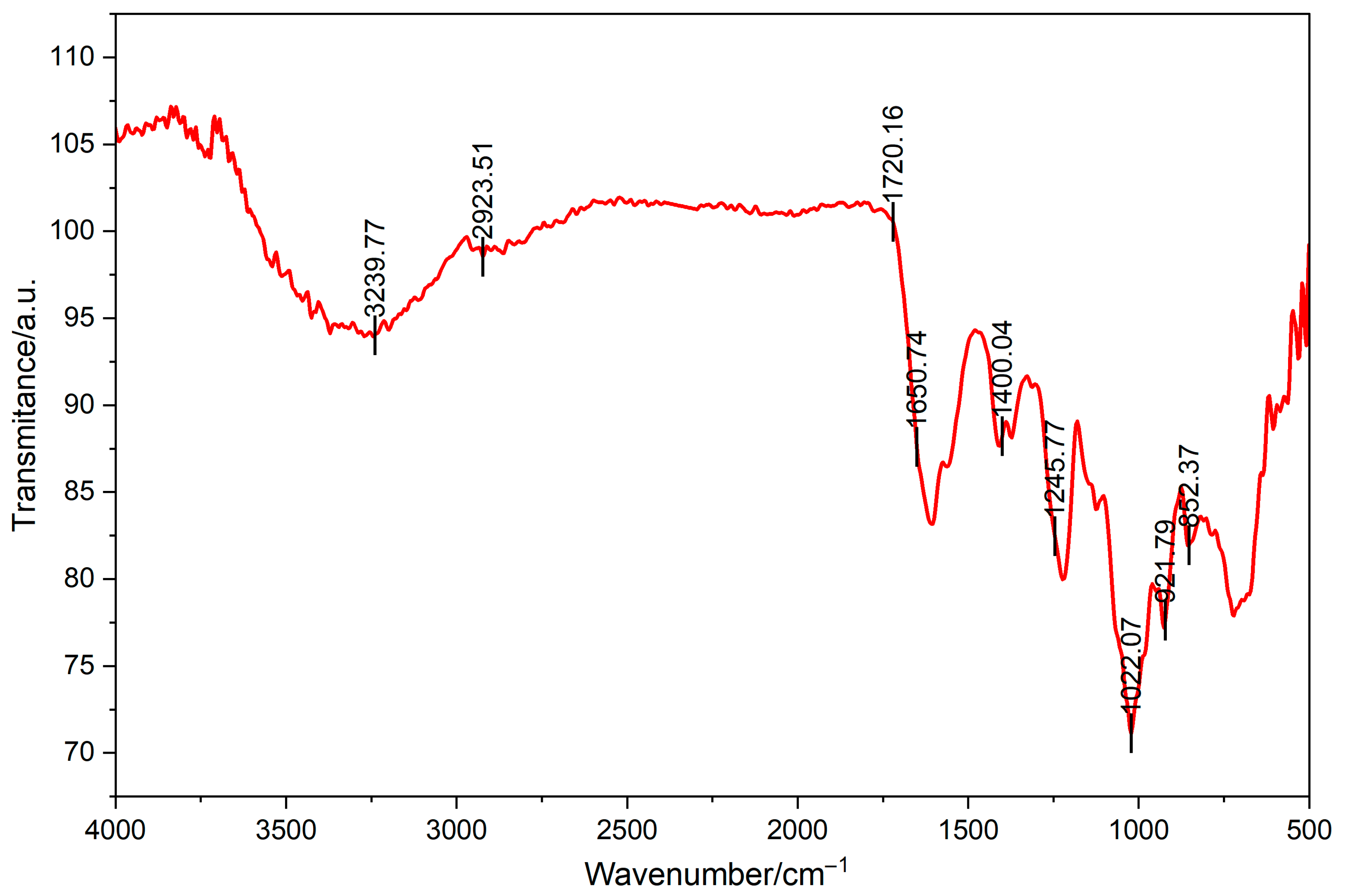 Data from Fourier transform infrared spectrometer were shown in Figure 2. A broad and strong absorption peak was observed in the range of 3400–3200 cm−1, attributed to the stretching vibration of hydroxyl groups (O-H) in polysaccharide molecules, indicating the presence of numerous hydroxyl groups in polysaccharides. The broadening of this peak may be attributable to intermolecular or intramolecular hydrogen bonding interactions. The absorption peak that appears in the range of 2930–2880 cm−1 is attributed to the stretching vibration of C-H, indicating the presence of alkyl structures in the polysaccharide. This peak is a characteristic of the C-H bond on the monosaccharide ring, indicating the presence of monosaccharides such as glucose and galactose structure within the sugar. The weak absorption peak that appears at 1740–1720 cm−1 may be attributed to the stretching vibration of carbonyl groups (C=O) in uronic acid or ester structures. The absorption peak that appears at a range of 1400–1300 cm−1 is attributed to the bending vibration of C-O-H, thereby further confirming the presence of hydroxyl groups in polysaccharides. The strong absorption peak that appears at wavenumbers between 1200 and 1000 cm−1 is attributed to the stretching vibration of C-O-C and C-O-H, indicating the presence of glycosidic bonds and hydroxyl groups in the polysaccharide. The absorption peaks that are observed at 920 cm−1 and 850 cm−1 may be attributed to the characteristic vibrations of α-glycosidic bonds and β-glycosidic bonds, respectively. The spectrum shows characteristic absorption peaks of CS. Notably, the strong absorption peak at ~1245 cm−1 attributed to the S=O stretching vibration of the sulfate ester, and the peak at ~850 cm−1 corresponding to the C-O-S stretching vibration characteristic of C4-sulfation in galactosamine residues. As demonstrated in the preceding analysis, the polysaccharide is predominantly composed of glucose and galactose moieties, and the glycosidic bond type may be a combination of α- and β-type.