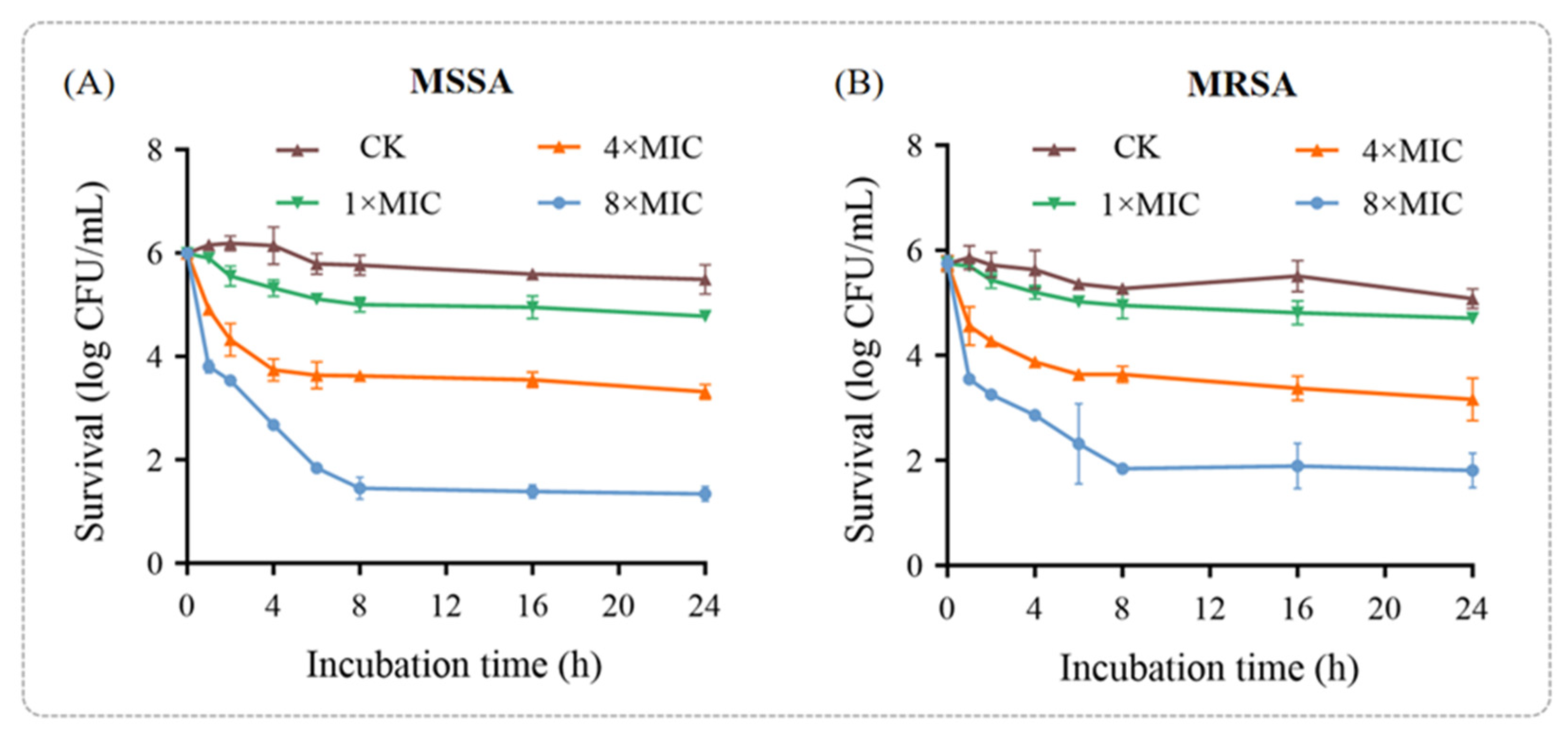 Figure 1). The results demonstrated that the bactericidal effect of punicalagin on both MSSA and MRSA exhibited a dose-dependent pattern, with greater potency observed within the first hour of treatment. For MSSA, the bactericidal effect of punicalagin at 1 × MIC was negligible. However, after 1 h of treatment with 4 × MIC and 8 × MIC punicalagin, the colony counts decreased by 1.09 and 2.19 log CFU/mL, respectively, compared to the initial inoculum (10
