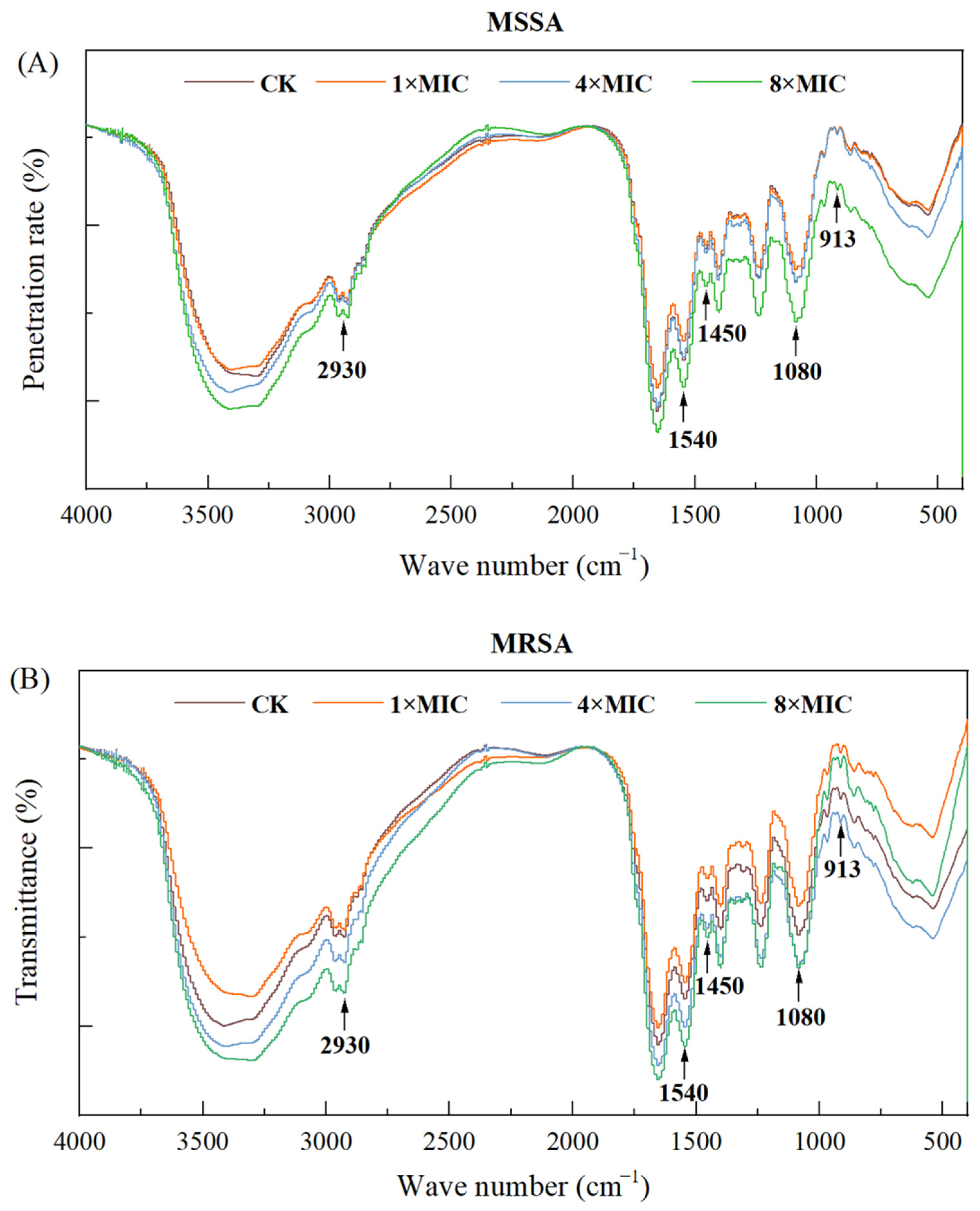 Fourier transform infrared spectroscopy (FTIR) was used to determine the conformational changes in the functional groups of bacterial membrane components [