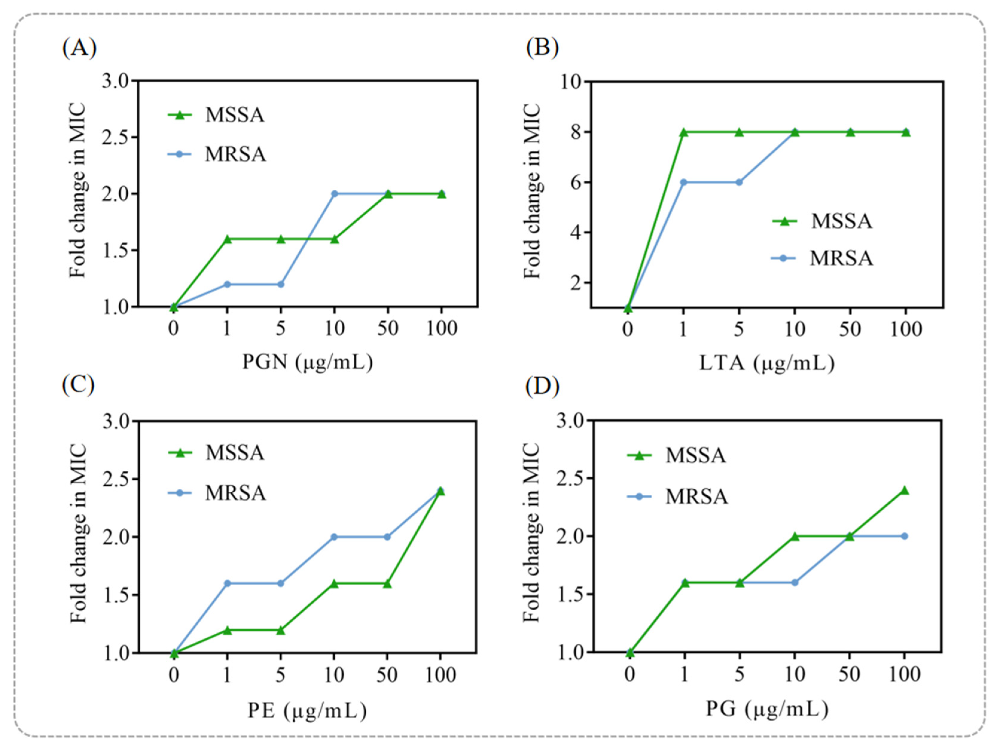 Peptidoglycan (PGN) and lipoteichoic acid (LTA) are the main lipid components of bacterial cell wall. Phosphatidylethanolamine (PE) and phosphatidylglycerol (PG) are the main lipid components of bacterial cell membrane and the most important phospholipids in MSSA and MRSA. Based on MIC analysis, an exogenous addition assay of PGN, LTA, PE and PG was performed [