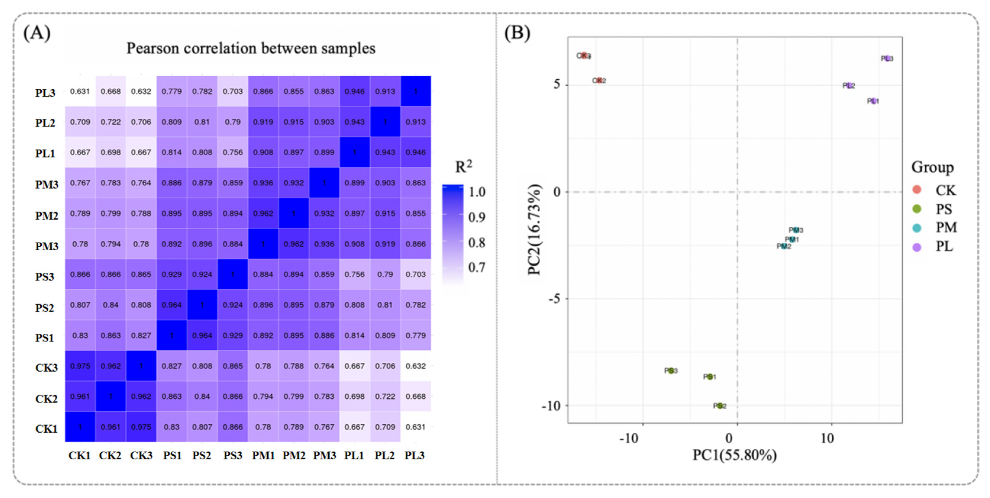 42]. The Pearson correlation coefficient (R2) is used to measure the correlation between samples; samples with an R