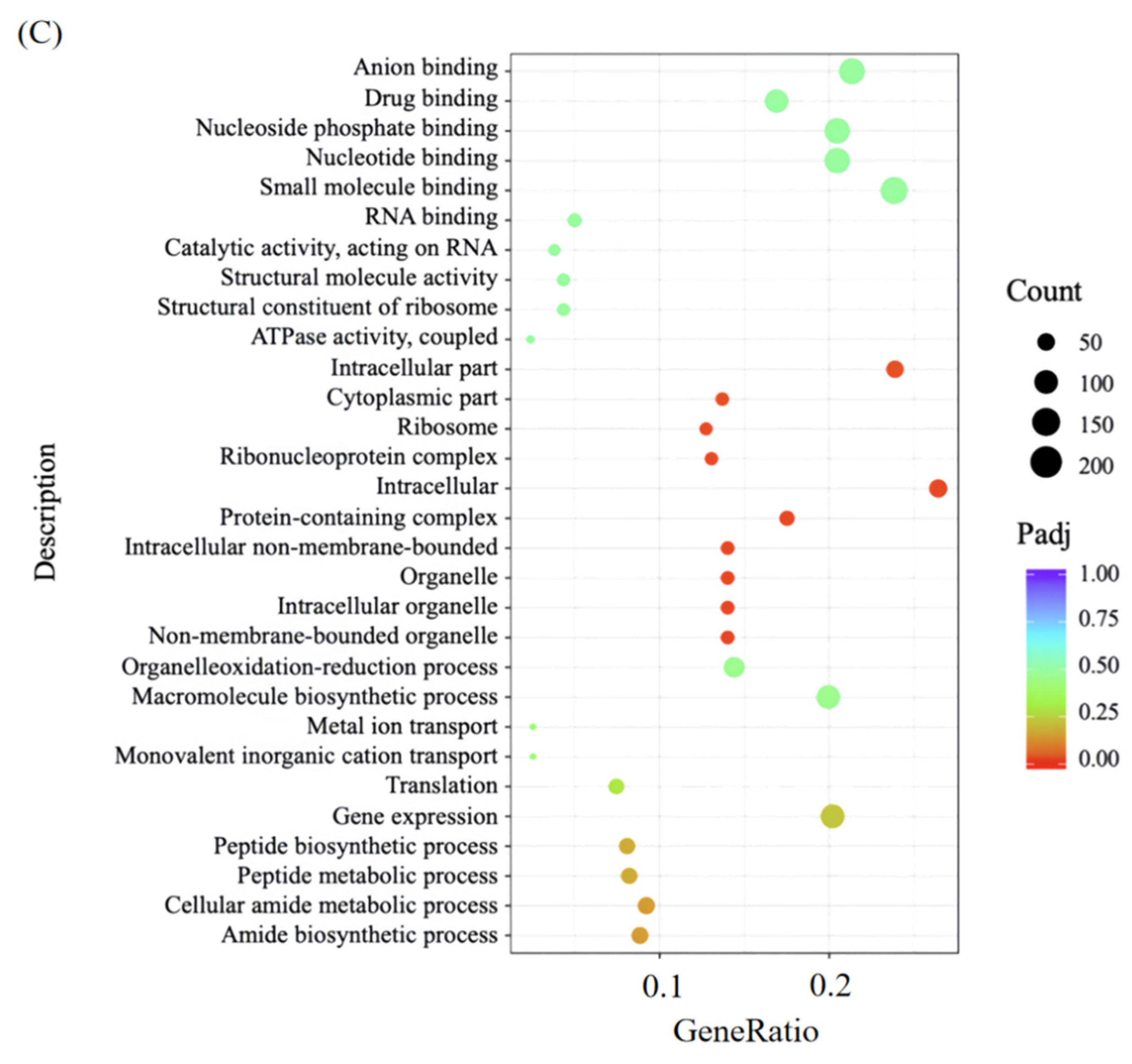 In molecular function (MF), most DEGs were enriched in small molecule binding, specifically targeting nucleotides (e.g., ATP), nucleoside phosphates, and anions (