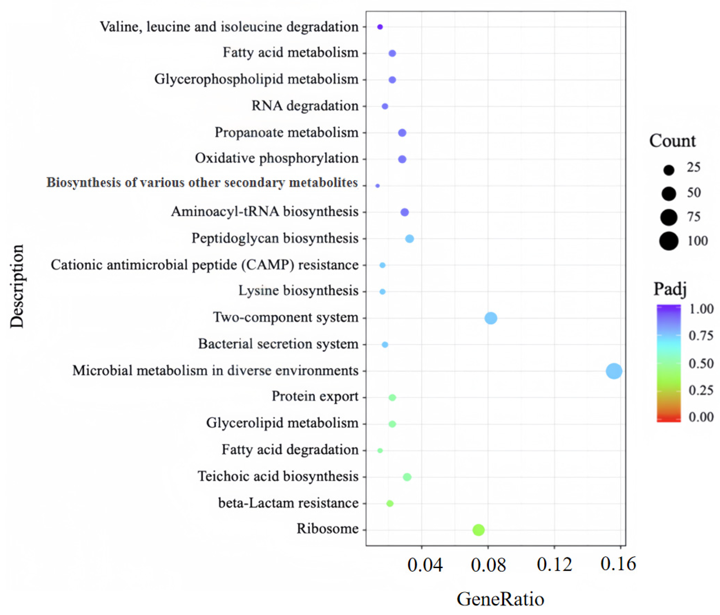 Figure 8. The enrichment results demonstrated that DEGs were significantly concentrated in several key pathways critical for MRSA survival, including: (1) ribosome, (2) teichoic acid biosynthesis, (3) fatty acid degradation, (4) valine, leucine and isoleucine degradation, (5) RNA degradation pathway.