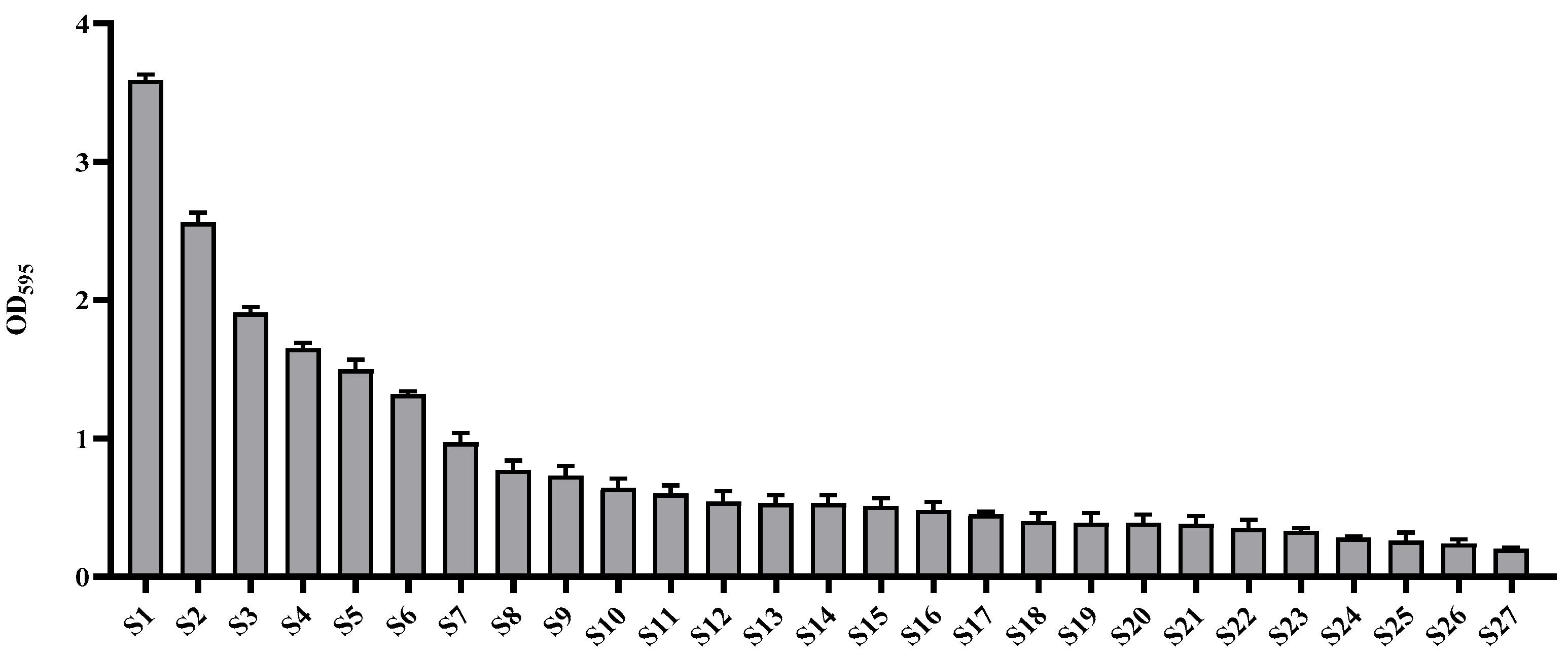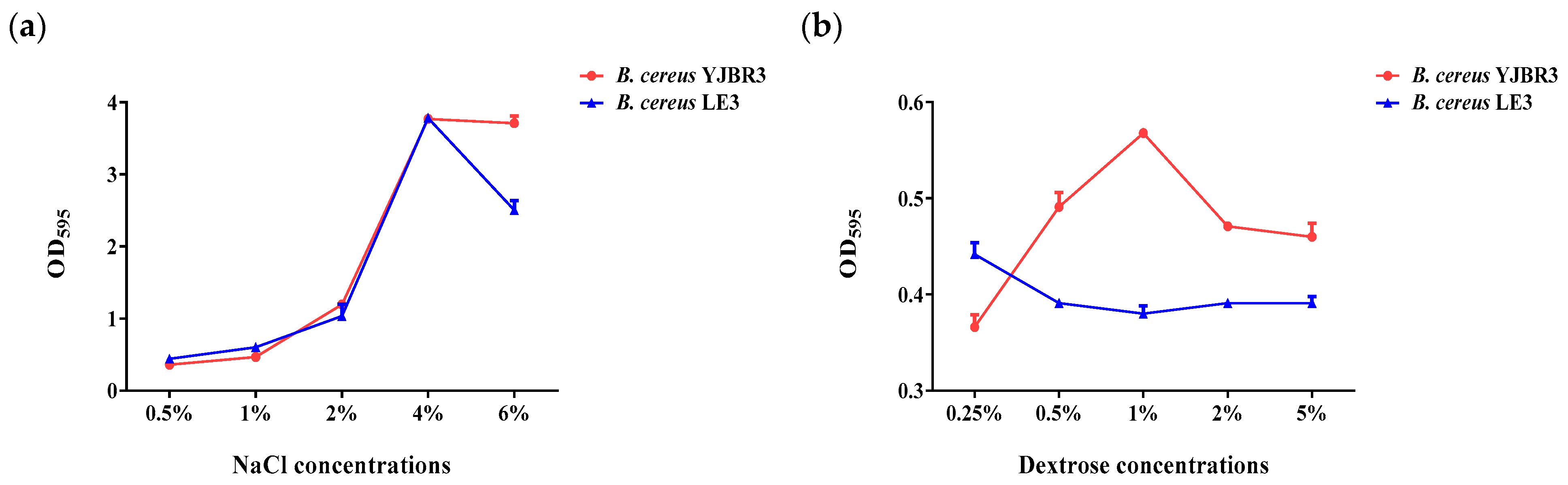 2.9. Evaluation of Biofilm Formation in Response to NaCl and Dextrose Concentration