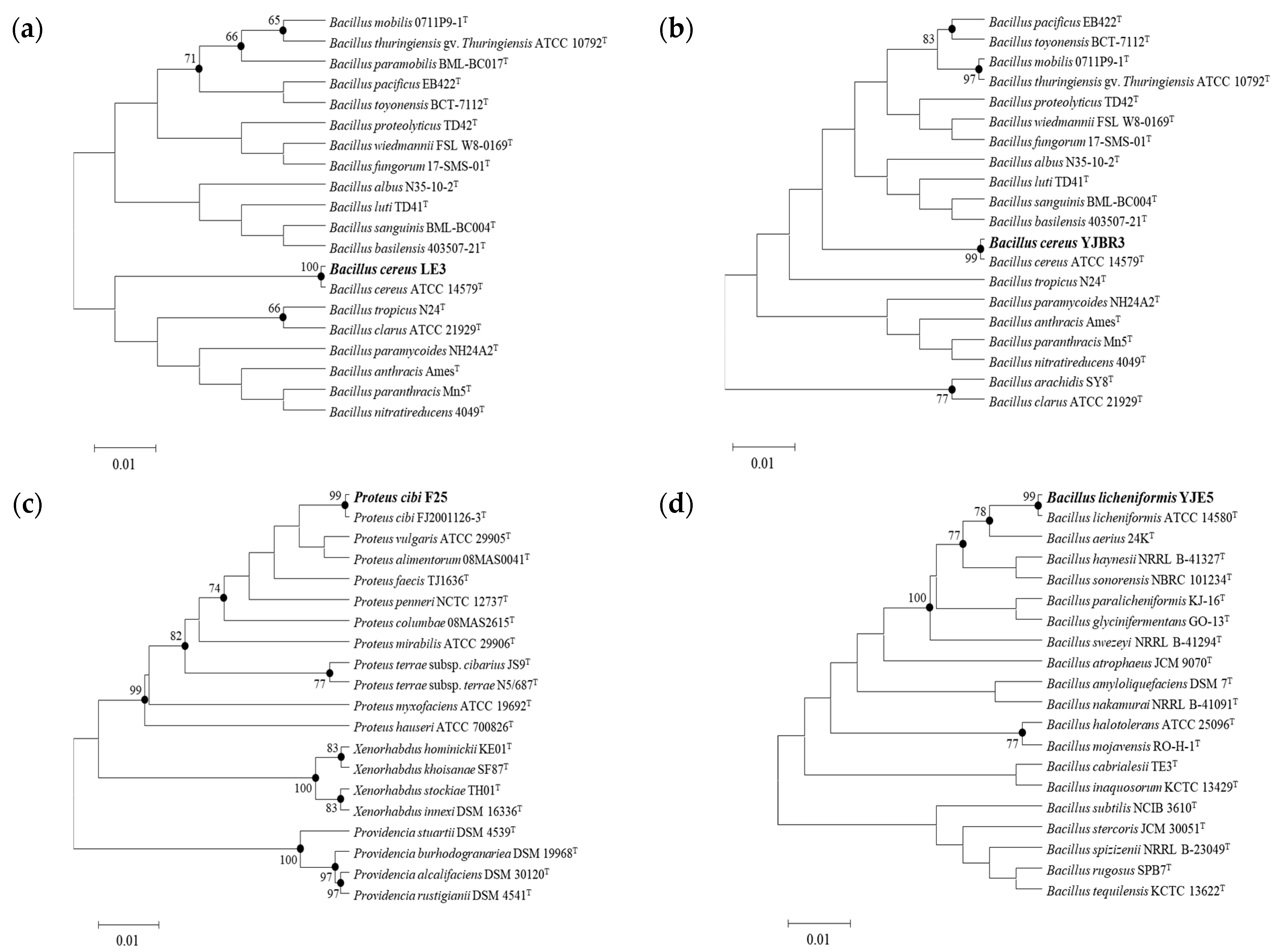 - Dai, H.; Chen, A.; Wang, Y.; Lu, B.; Wang, Y.; Chen, J.; Huang, Y.; Li, Z.; Fang, Y.; Xiao, T.; et al. Proteus faecis sp. nov., and Proteus cibi sp. nov., two new species isolated from food and clinical samples in China. Int. J. Syst. Evol. Microbiol. 2019, 69, 852–858. [Google Scholar] [CrossRef]