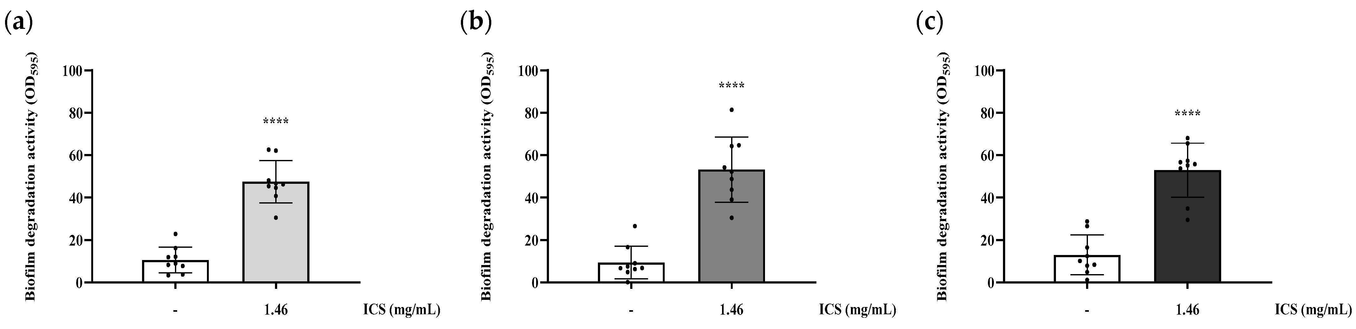 3.4. Biofilm-Degrading Activity of ICS from B. licheniformis YJE5