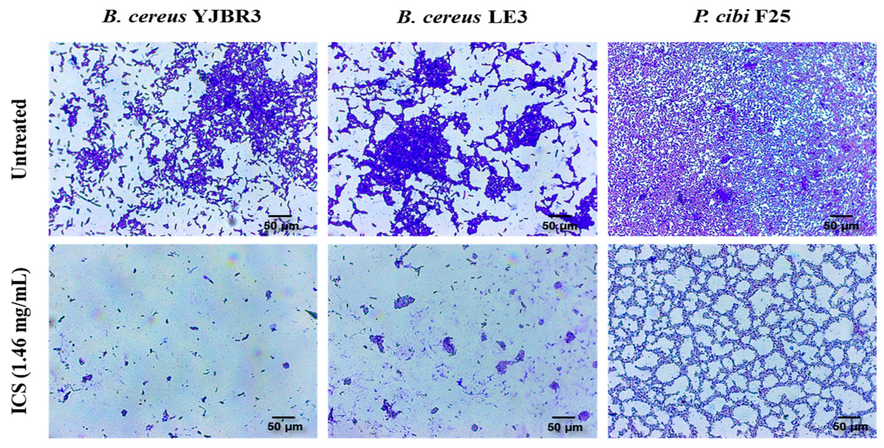 3.5. Observation of Biofilm Degradation Following Treatment with ICS from B. licheniformis YJE5
