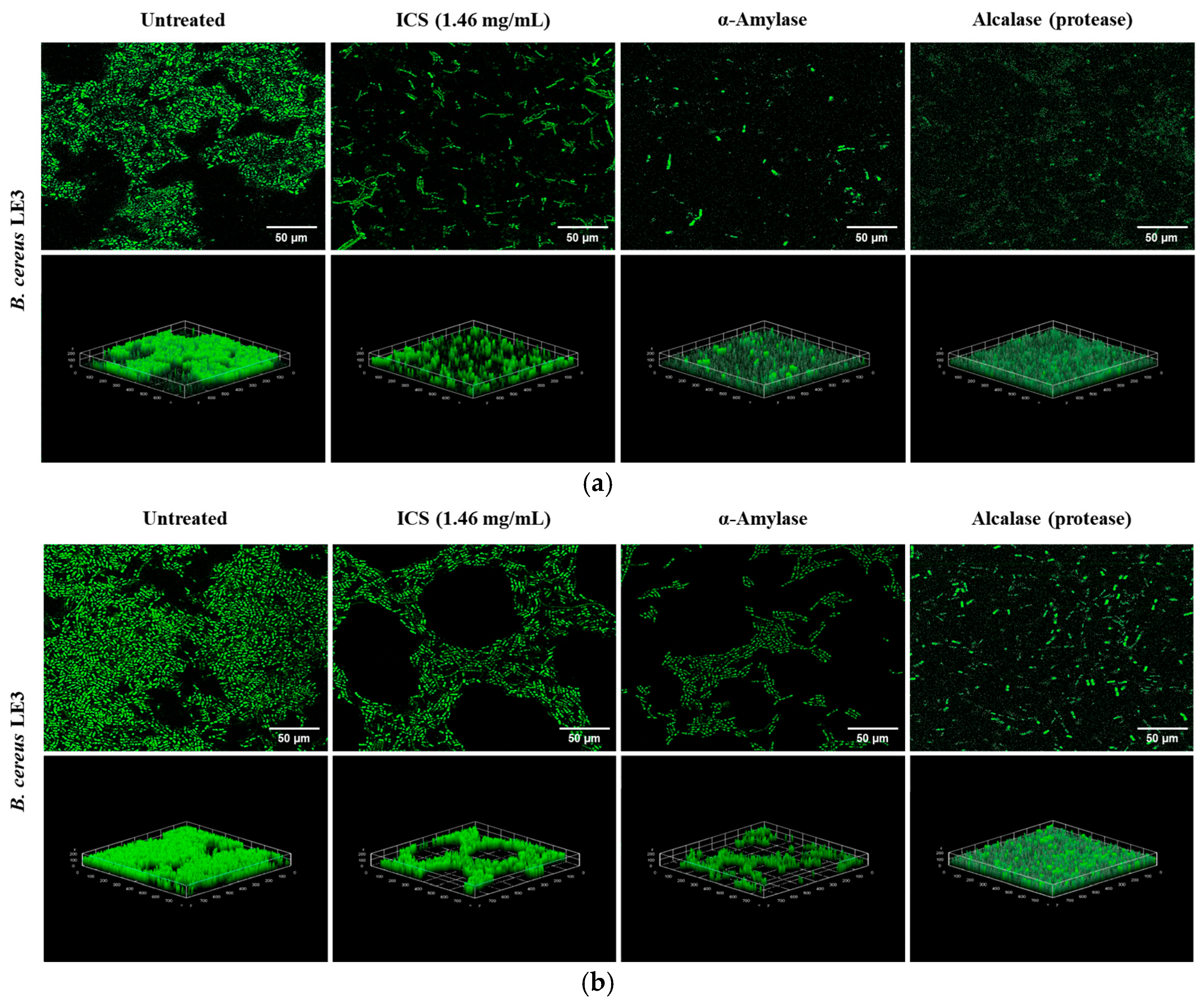 3.7. CLSM Analysis of Biofilm-Degrading Activity of ICS from B. licheniformis YJE5