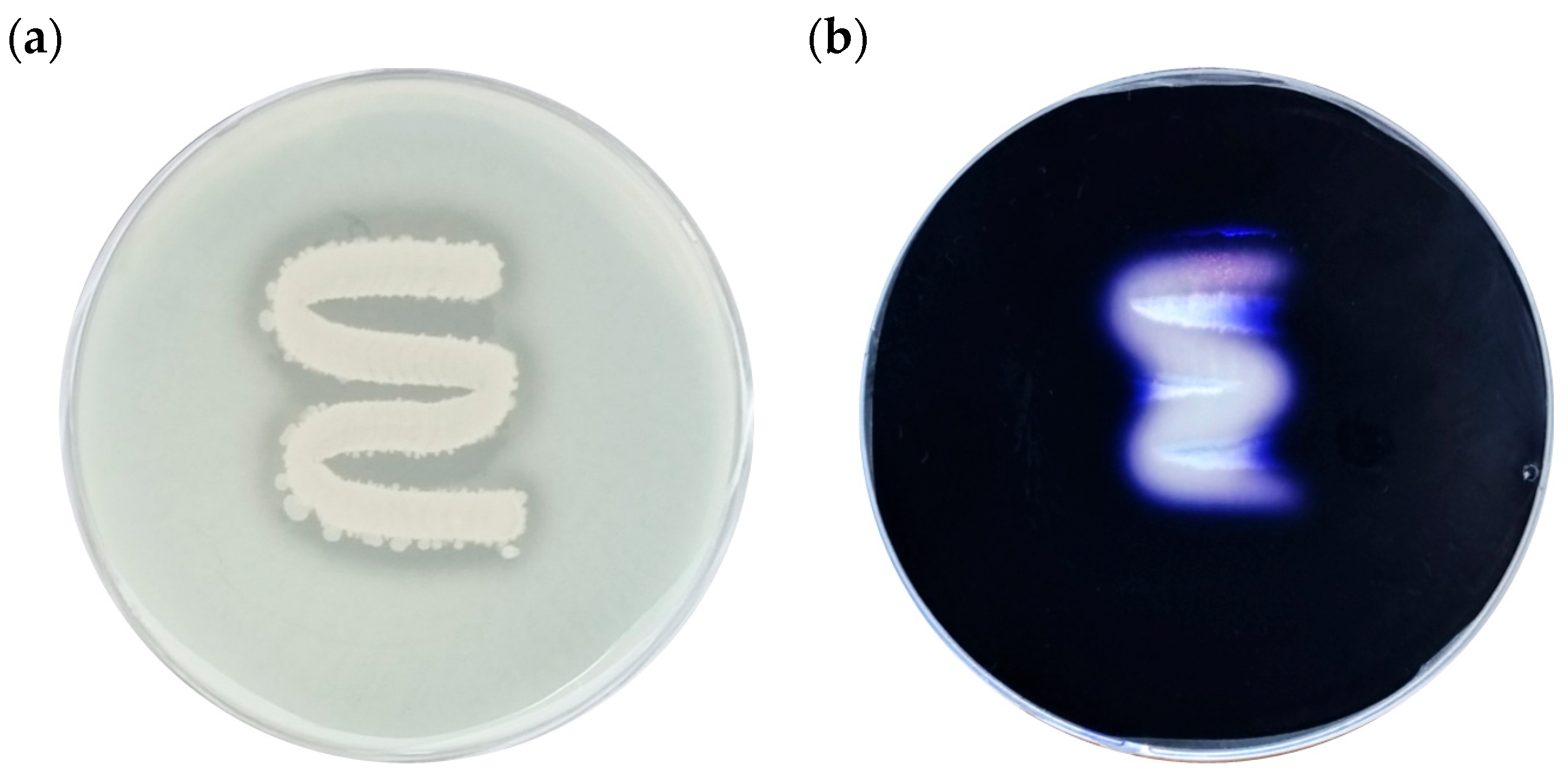 3.9. Enzymatic Activity Profile of B. licheniformis YJE5 Determined Using the API ZYM Kit