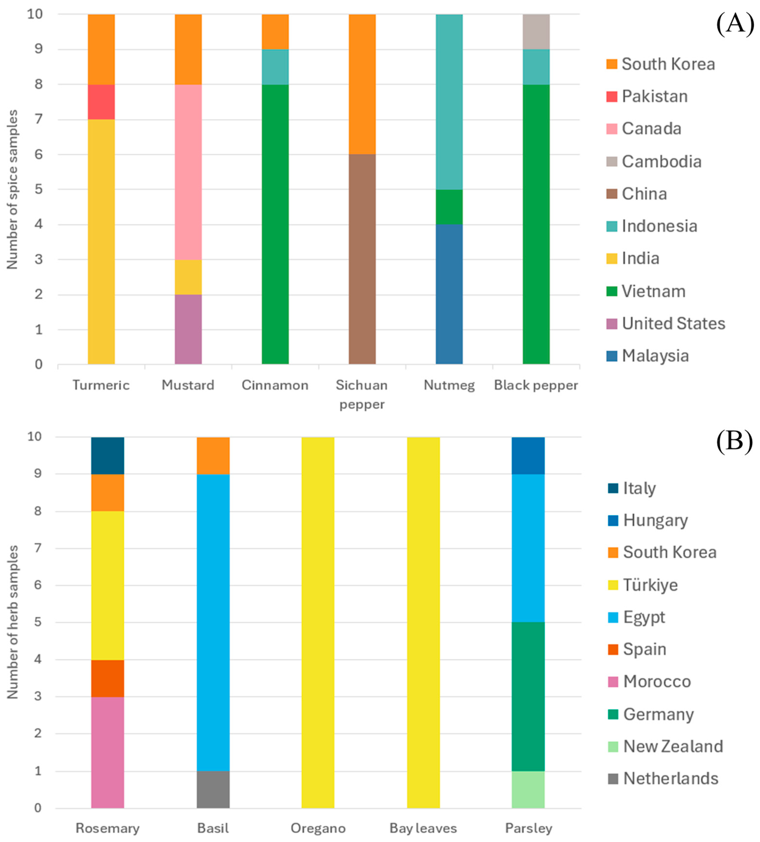 - Di Bella, G.; Potortì, A.G.; Ben Tekaya, A.; Beltifa, A.; Ben Mansour, H.; Sajia, E.; Bartolomeo, G.; Naccari, C.; Dugo, G.; Lo Turco, V. Organic contamination of Italian and Tunisian culinary herbs and spices. J. Environ. Sci. Health B 2019, 54, 345–356. [Google Scholar] [CrossRef]