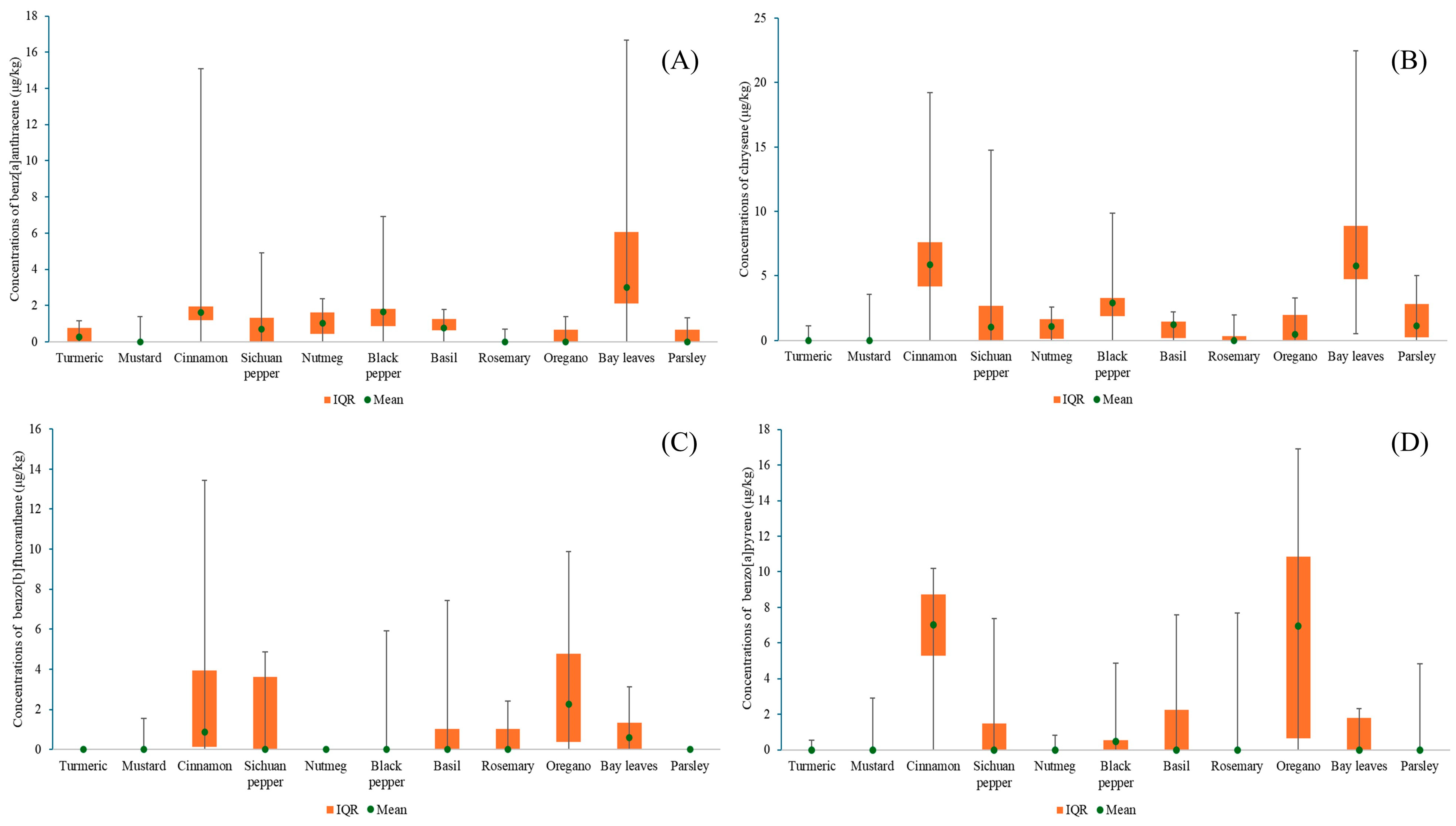 - Szternfeld, P.; Marakis, A.; Scippo, M.-L.; Van Hoeck, E.; Joly, L. Polycyclic aromatic hydrocarbons in spices and dried herbs and associated risk for the Belgian population. Food Addit. Contam. Part B 2022, 15, 292–300. [Google Scholar] [CrossRef]