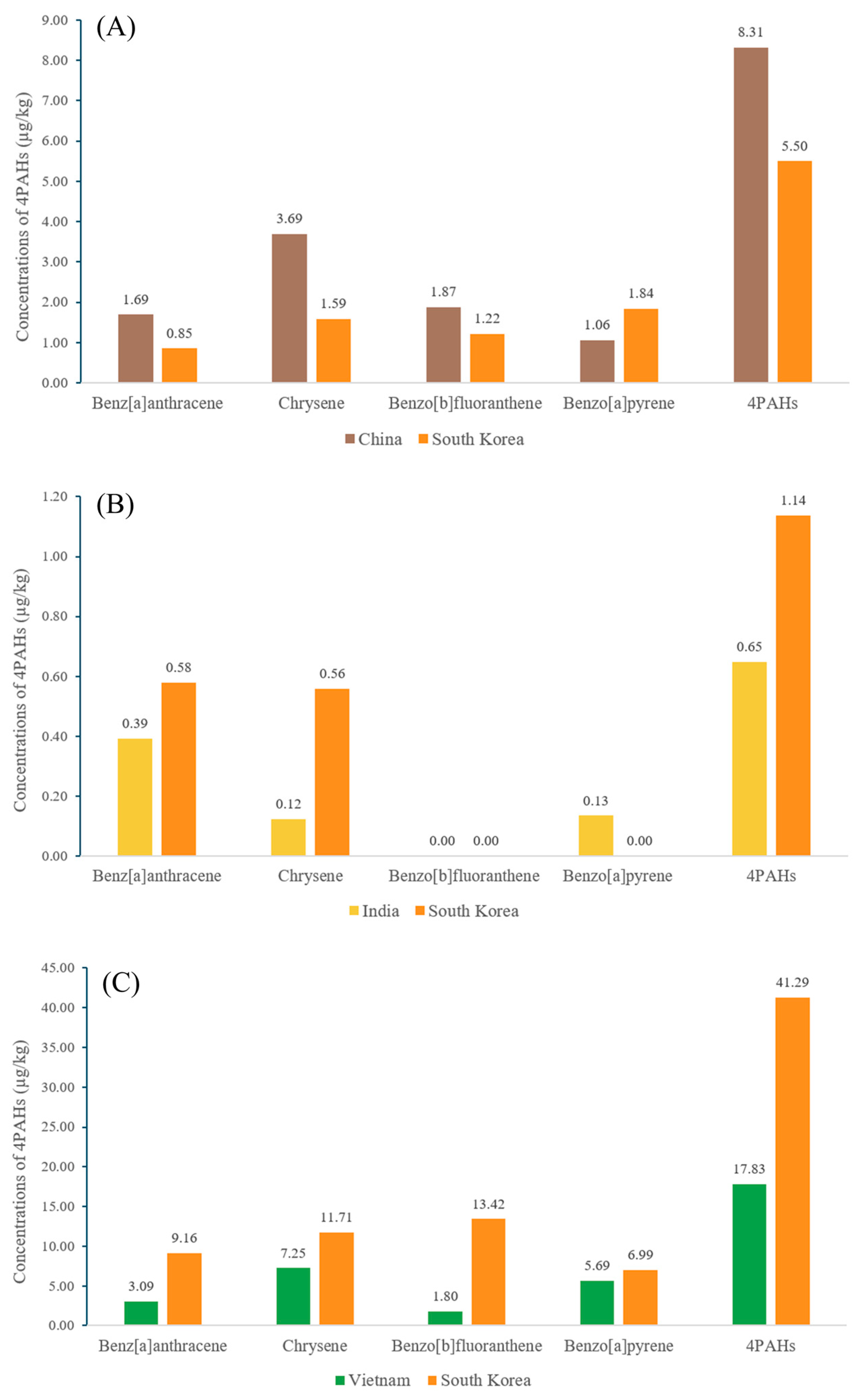 - Hwang, H.-J.; Lee, S.-H.; Kim, Y.-Y.; Shin, H.-S. Polycyclic aromatic hydrocarbon risk assessment and analytical methods using QuEchERS pretreatment for the evaluation of herbal medicine ingredients in Korea. Foods 2021, 10, 2200. [Google Scholar] [CrossRef]