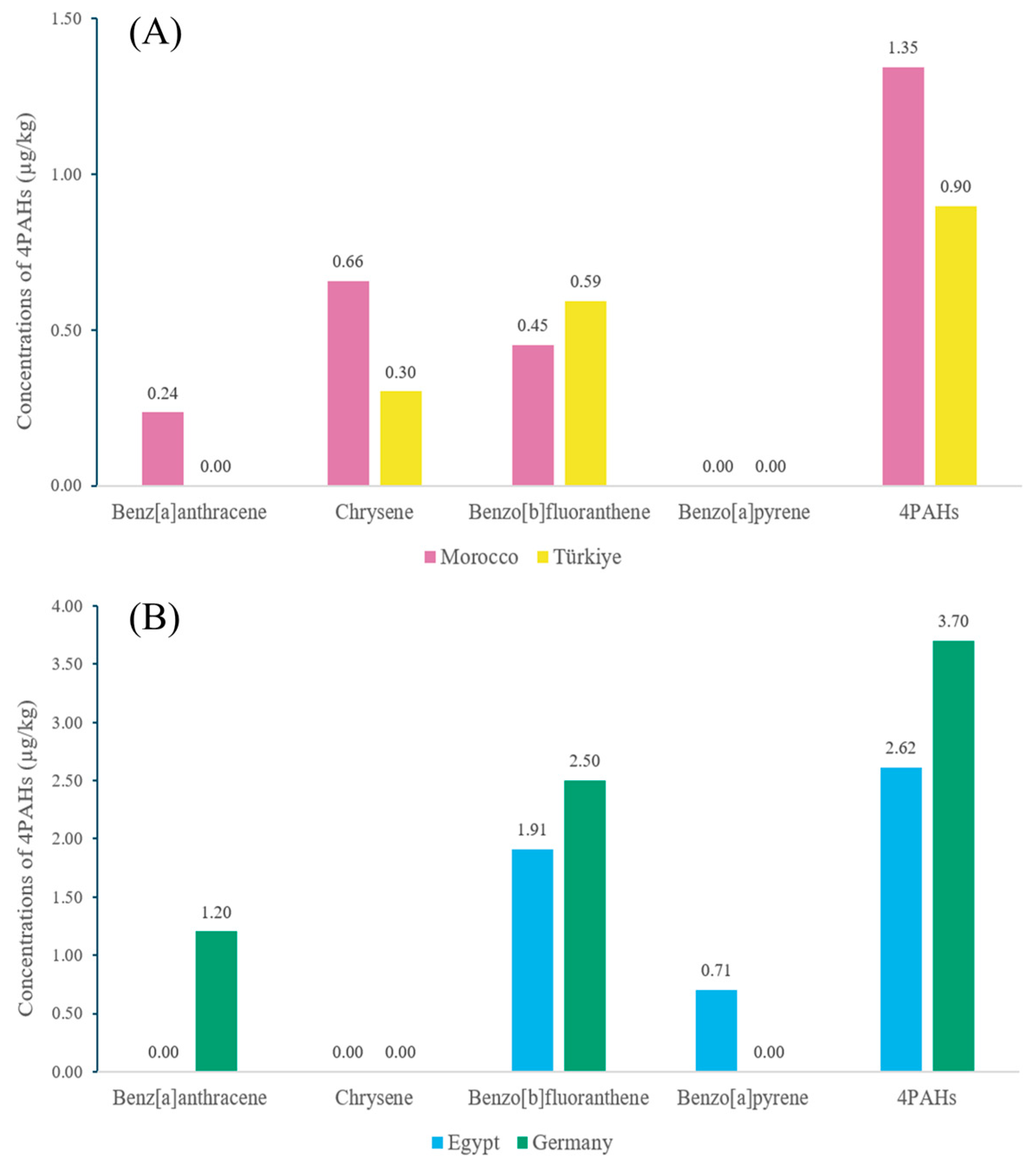 - Du, W.; Jiang, S.; Lei, Y.; Wang, J.; Cui, Z.; Xiang, P.; Chang0, Z.; Duan, W.; Shen, G.; Qin, Y. Occurrence, formation mechanism, and health risk of polycyclic aromatic hydrocarbons in barbecued food. Ecotoxicol. Environ. Saf. 2025, 293, 118046. [Google Scholar] [CrossRef]