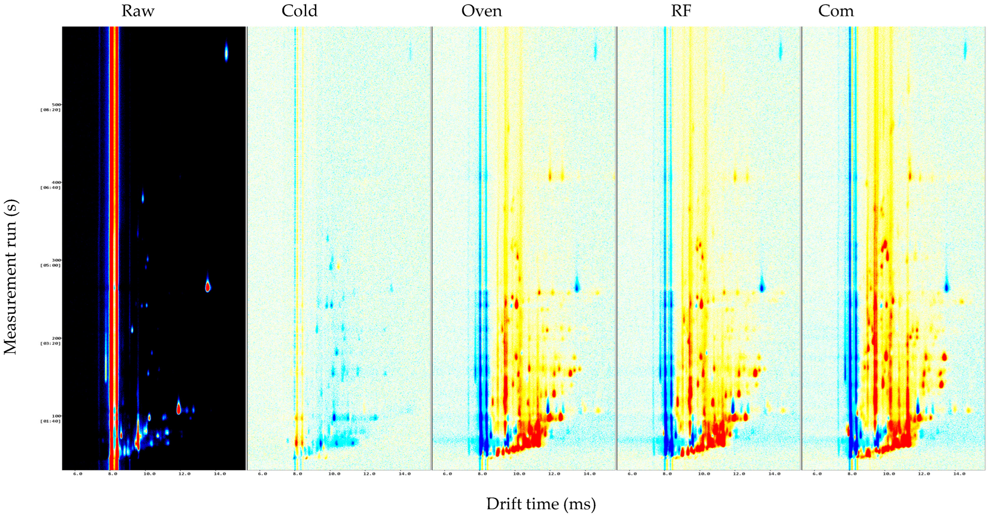 - Ma, C.; Nie, H.; Liu, L.-X.; Wang, F.-R.; Chen, Y.; Zhang, W.; Liu, Y.-G. Gas chromatography–ion mobility spectrometry (GC-IMS) technique and its recent applications in grain research. J. Sci. Food Agric. 2024, 104, 9093–9101. [Google Scholar] [CrossRef] [PubMed]