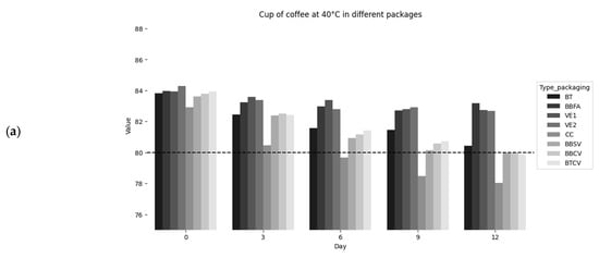 Figure 1 shows the results of the sensory evaluation of the eight coffee packages, highlighting their ability to preserve quality during accelerated storage (40, 50, and 60 °C). The results showed that most samples maintained their specialty coffee status. Although natural sensory degradation was observed, it was not sufficient to cause the coffees in most packages to fall below the 80-point threshold. This phenomenon has been widely reported in previous studies, which show similar behaviour in the quality of speciality coffees under storage conditions [41,42,43].