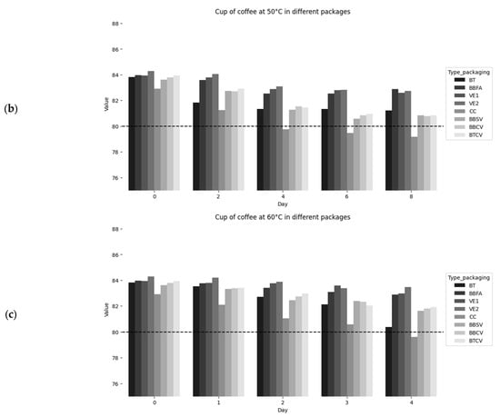 Cup scores for each presentation and packaging during accelerated storage at 40 °C (a), 50 °C (b), and 60 °C (c). BT: tocuyo bag. BBFA: bilaminated aluminum foil bag. VE1: Ecotac vacuum bag with green beans. VE2: Ecotac vacuum bag with roasted beans. CC: pressed cardboard box. BBSV: bilaminated bag without valve, with window and zipper. BBCV: bilaminated bag with degassing valve and zipper. BTCV: trilaminate bag with degassing valve and zipper.