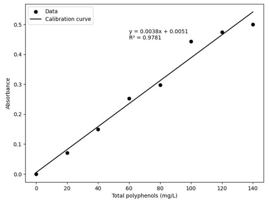 Figure 2 shows the calibration curve for polyphenols with respect to absorbance, establishing the regression model y = 0.0038x + 0.0051 with an R2 of 0.9781.