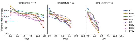 Temporal trends in total polyphenols in specialty coffee samples under accelerated storage conditions. BT: Tocuyo bag with green beans. BBFA: Bilaminated aluminum bag with green beans. VE1: Ecotac vacuum bag with green beans. VE2: Ecotac vacuum bag with roasted beans. CC: Pressed cardboard box with ground roasted coffee. BBSV: Bilaminated bag without valve, with window and zipper, with ground roasted coffee. BBCV: bilaminate bag with degassing valve and zipper with ground roasted coffee. BTCV: trilaminate bag with degassing valve and zipper with ground roasted coffee.