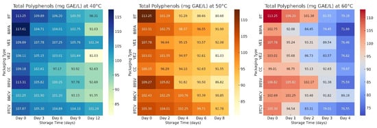 At higher storage temperatures, as shown in Table 3 (50 °C) and Table 4 (60 °C), the polyphenol content decreases progressively in all types of packaging, although the impact varies depending on the type of packaging. Bilinamized bags, for example, act as effective barriers against the loss of important compounds, resulting in greater polyphenol retention compared to less efficient packaging, such as paper [36,62].