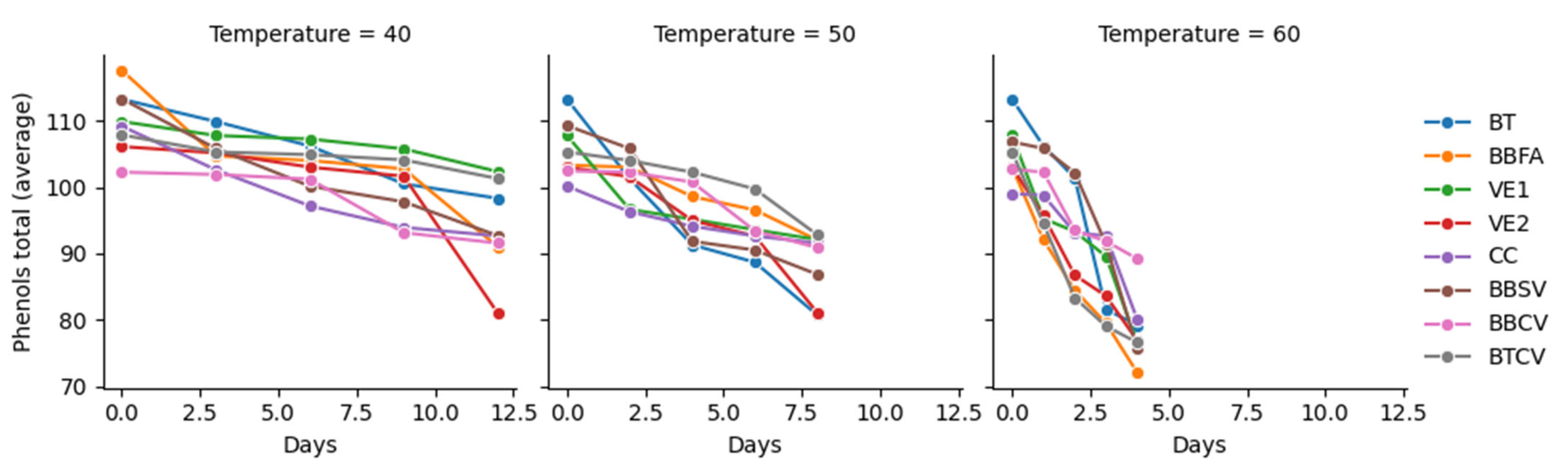 3.5. Estimated Half-Life of Total Polyphenol Retention