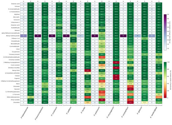 When testing the antifungal activity in liquid medium, all compounds were tested against the ten bread moulds at one fixed concentration, 500 µg/mL, and evaluated for their ability to inhibit growth after 48 h of incubation. Figure 1B summarizes the percentage of relative growth inhibition of the best-performing compounds, while Supplementary Table S2B contains the percentage relative growth inhibition of the entire plant secondary metabolite collection. More compounds were able to inhibit mould growth in the liquid medium compared to the agar disc diffusion assay. Of the 218 compounds tested against ten moulds, total growth inhibition was reached 5 times (0.23%) in the agar disc diffusion assay and 125 times (5.73%) in the screening in liquid medium. Besides benzyl isothiocyanate, many plant secondary metabolites showed weak or no inhibition in the agar disc diffusion assay, while being good to strong inhibitors in the liquid medium, with 14.31% and 19.27% of the compounds having relative growth inhibition above 90% and 80%, respectively.