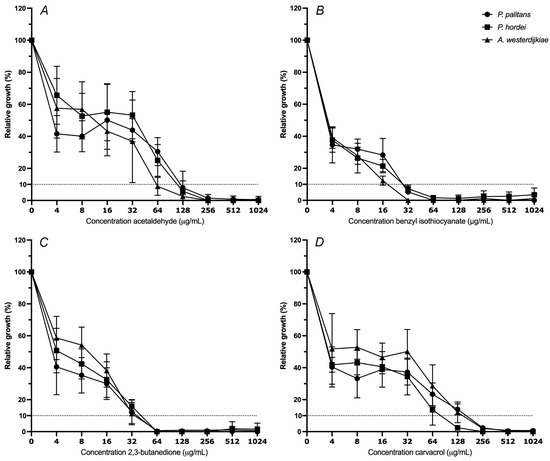 Relative growth (%) of Penicillium palitans (●), P. hordei (■) and Aspergillus westerdijkiae (▲) at increasing concentrations (µg/mL) of acetaldehyde (A), benzyl isothiocyanate (B), 2,3-butanedione (C) and carvacrol (D). Each experiment contained three technical repeats and was repeated twice. Growth is relative to the condition containing no treatment (0 µg/mL) and is the average of six repeats. The dotted line indicates 10% of relative growth.