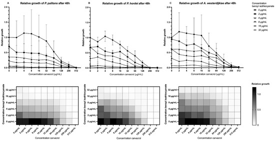 Relative growth of (A) P. palitans, (B) P. hordei and (C) A. westerdijkiae at different concentrations of carvacrol and benzyl isothiocyanate after 48 h of incubation. Each experiment contained three technical repeats and was repeated twice. Growth is relative to the condition containing no treatment (0 µg/mL) and is the average of six repeats.