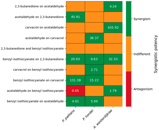 The synergistic potency of the five most interesting combinations is depicted in Figure 4. Synergistic potency and the confidence interval of all combinations can be found in Supplementary Table S4. Benzyl isothiocyanate was able to increase the potency of 2,3-butanedione against P. palitans, P. hordei and A. westerdijkiae. When combining aldehydes with carvacrol, synergistic interactions occurred as well. 2,3-butanedione increased carvacrol’s potency against P. palitans and P. hordei; however, 2,3-butanedione’s activity was negatively affected by carvacrol when tested against P. hordei. Acetaldehyde improved the activity of carvacrol against P. hordei while carvacrol had a positive effect on acetaldehyde against A. westerdijkiae. Combinations with hexanoic acid, octanoic acid or allyl isothiocyanate resulted in no synergy or synergy against only one of the three tested species.