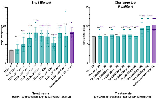 Shelf life and challenge test with P. palitans with no treatment (T0, n = 12), treatment with ethanol (T1, n = 10), combinations of benzyl isothiocyanate (µg/mL) and carvacrol (µg/mL) (T2–T9, n = 10) and propionic acid (0.15%, n = 14). Par-baked bread was surface sprayed using an airbrush system, packaged under modified atmosphere and stored at 22 °C. Samples were checked daily for visible mould growth. Bars and error bars represent the mean and standard deviation, respectively. Dots indicate individual samples. Statistical analysis was performed between treated samples and either untreated samples or samples containing calcium propionate, with significance level shown in black or purple, respectively. (* p ≤ 0.05, ** p ≤ 0.01, *** p ≤ 0.001, **** p ≤ 0.0001, ns p > 0.05).