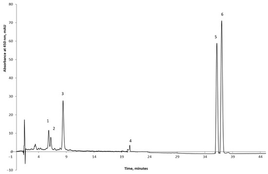 The HPLC profile of the carrot powder: 1—lutein; 2—zeaxanthin; 3—not identified; 4—not identified; 5—α-carotene; 6—β-carotene.